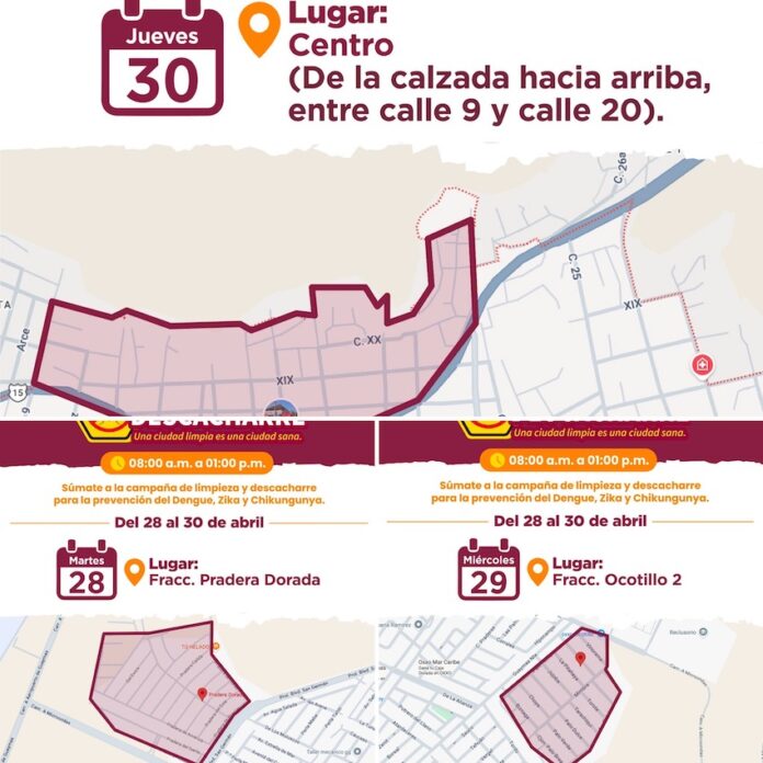 Estos trabajos serán en horario de 8:00 a.m. a 13:00 p.m. iniciando este martes en la colonia Pradera Dorada, miércoles 29 en Ocotillo II para cerrar el 30 de abril en el Centro (Calzada hacia arriba entre calles 9 y 20).
