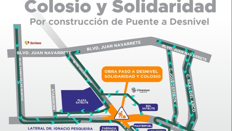 Las rutas alternas para los conductores que transiten del Norte a Sur de la ciudad sobre el bulevar Solidaridad deberán desviarse desde el supermercado Soriana Encinas por el bulevar Paseo de las Quintas hasta llegar al Colosio y retomar hacia el Solidaridad.