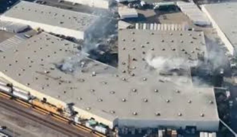 Imágenes difundidas por el canal de televisión KABC-TV puede verse una columna de humo negro saliendo de un agujero en el techo de uno de los varios almacenes del distrito comercial.