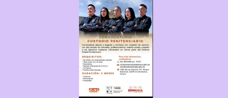 Para mayor información, invitó a las y los interesados en sumarse al trabajo de seguridad penitenciaria a comunicarse al teléfono 6621 080400, extensión 10153, y al correo electrónico reclutamiento@siepsonora.gob.mx y reclutamiento@isspe.gob.mx.