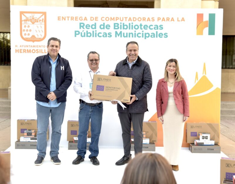 Hermosillo, Sonora; 6 de febrero de 2025.- “Computadoras nuevas porque necesitamos espacios funcionales, bonitos, dignos para poder beneficiar con conocimiento y poder construir comunidad”, expuso el presidente municipal Antonio Astiazarán Gutiérrez, al entregar 30 equipos de cómputo para la Red de Bibliotecas Públicas Municipales del Instituto Municipal de Cultura y Arte (IMCA).