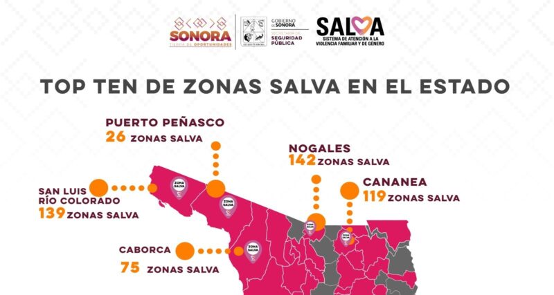 Encabezan la lista de los 10 municipios con mayor número de Zonas Salva en la entidad: Hermosillo con mil 410, Cajeme con 572, Empalme con 149, Nogales con 142, San Luis Río Colorado con 139, Cananea con 119, Guaymas con 107, Navojoa con 82, Caborca con 75 y Puerto Peñasco con 26.