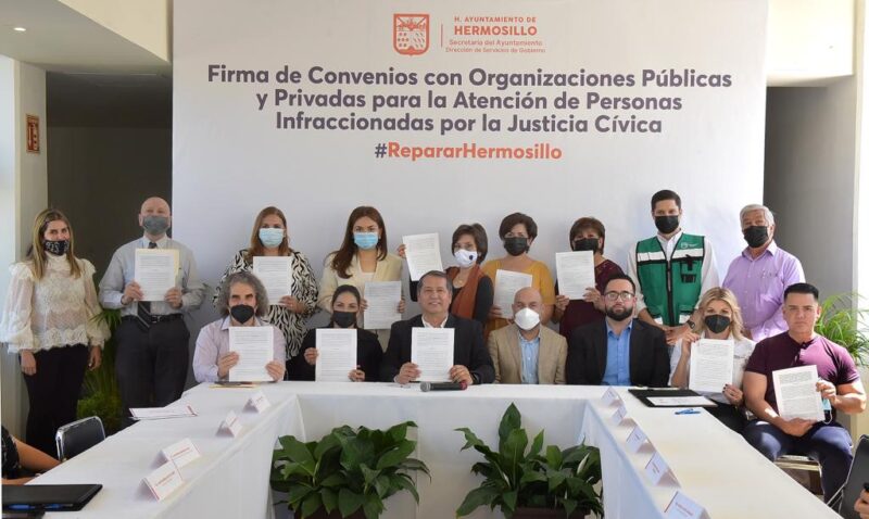 Hermosillo, Sonora.- Para que personas infraccionadas por la Justicia Cívica puedan tener las posibilidades de pagar una falta administrativa con prestar trabajo comunitario, acudir a apoyo psicológico o rehabilitación, el Ayuntamiento de Hermosillo y organizaciones públicas y privadas firmaron un convenio de colaboración.