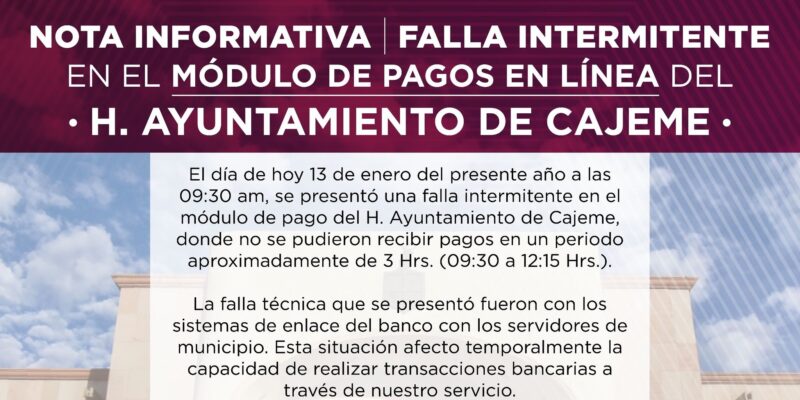 El H. Ayuntamiento de Cajeme informa a la ciudadanía que, el día de hoy, 13 de enero, se presentó una falla intermitente en el módulo de pagos en línea, lo que afectó temporalmente la capacidad de recibir pagos a través de nuestro portal en línea, el inconveniente tuvo una duración de aproximadamente tres horas, desde las 09:30 hasta las 12:15 horas.