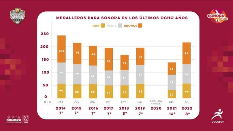 La delegación sonorense consiguió su mejor desempeño en los últimos ocho años en los Nacionales Conade (antes Olimpiada Nacional), al finalizar con 66 medallas de oro en la edición 2022, además, fue el regreso de Sonora como sede después de 13 años tras recibir trece deportes del 3 de junio al 26 de julio, once de ellos en Hermosillo y dos Guaymas.