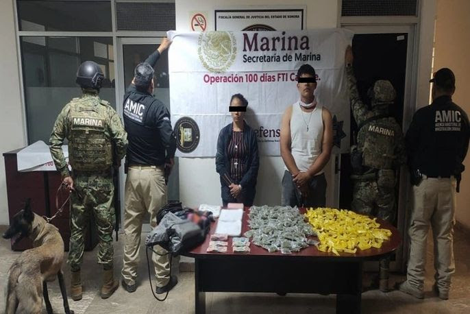 -En Ciudad Obregón, durante el desarrollo de la Operación “F.T. Interinstitucional 100 días Cajeme”, personal de Semar y de la Agencia Ministerial de Investigación Criminal (AMIC) ejecutó una orden de cateo a un domicilio donde detuvieron a dos personas, aseguraron 134 envoltorios de marihuana, 198 dosis de metanfetamina, dinero en efectivo y una motocicleta, en la colonia Las Haciendas.