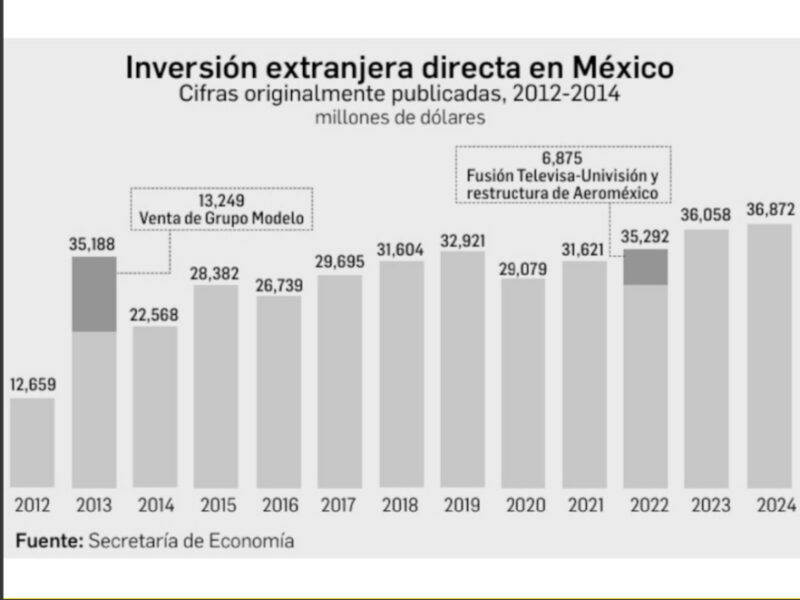 Por la tarde, la SE confirmó el máximo histórico que alcanzó la IED en 2024, la cual se encuentra incluso por encima de la que fue captada en 2022, de 35 mil 292 millones de dólares, la cual incluye la fusión entre Televisa-Univisión y la restructura de Aeroméxico; al igual que de los 35 mil 188 millones de dólares de 2013, año de la venta de Grupo Modelo.