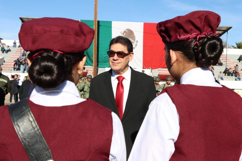 Nogales, Sonora; 24 de febrero de 2026.– En el marco del Día de la Bandera, el alcalde Juan Francisco Gim Nogales presidió la ceremonia de abanderamiento de 14 escoltas, pertenecientes a igual número de escuelas de nivel primaria, secundaria y preparatoria.