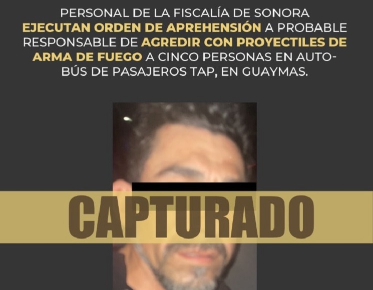 Hermosillo, Sonora, marzo 14 de 2022.- Elementos de la Agencia Ministerial de Investigación Criminal (AMIC), de la Fiscalía de Sonora, ejecutaron orden de aprehensión a un sujeto como probable responsable de disparar y herir con proyectiles de arma de fuego a cinco personas en un autobús de la Línea TAP en Guaymas.
