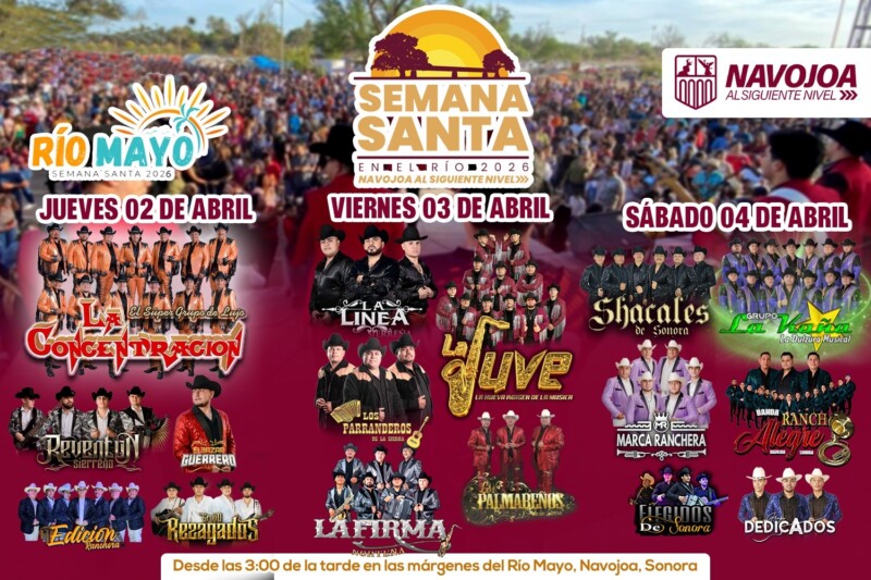 El Ayuntamiento de Navojoa te invita a vivir días llenos de música, ambiente y diversión en las márgenes del Río Mayo. Ven con tu familia y amigos a disfrutar de tres días espectaculares, 02, 03 y 04 de abril, con grandes agrupaciones en vivo, buen ambiente y toda la energía que solo esta celebración puede ofrecer.