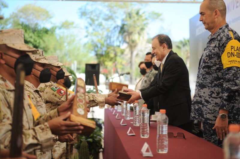 “Trabajamos todos los días sin descanso y, paulatinamente, iremos dando pasos hacia la restauración de nuestro tejido social. Soy optimista y estoy seguro de que la estrategia que llevamos a cabo, rendirá frutos para el bienestar de las y los sonorenses; con el apoyo de nuestras fuerzas armadas laboramos todos los días en la construcción de la paz, y llegará el día en que los resultados superaran a los obstáculos, no tengo absolutamente ninguna duda de ello”, reiteró.