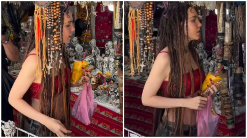 En las imágenes, la artista sostiene un vaso de mango y una bolsa de cacahuates, mientras recorre los puestos y revisa diversos productos, como camisetas.