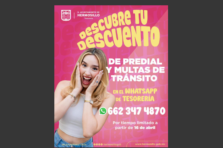 A partir de este jueves 16 de abril, el Gobierno de Hermosillo a través de Tesorería Municipal ofrece atractivos descuentos en pago predial y multas de tránsito por WhatsAapp, anunció Yazmina Anaya Camargo.