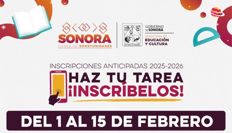 Hermosillo, Sonora.- A través de un proceso ágil, eficiente, sencillo y gratuito se llevarán a cabo en Sonora las Inscripciones Anticipadas para el ciclo escolar 2025-2026, del 1 al 15 de febrero, anunció la Secretaría de Educación y Cultura (SEC).