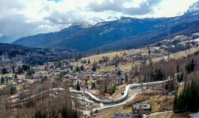 En febrero, en las alturas de Cortina d’Ampezzo, a unos metros de unos chalés y bajo los cables de un telecabina, 190 obreros trabajaban a destajo, siete días por semana, incluso a veces también por las noches, para tratar de construir en tiempo récord esta serpiente de hormigón que incluye instalaciones sofisticadas de fabricación de hielo.