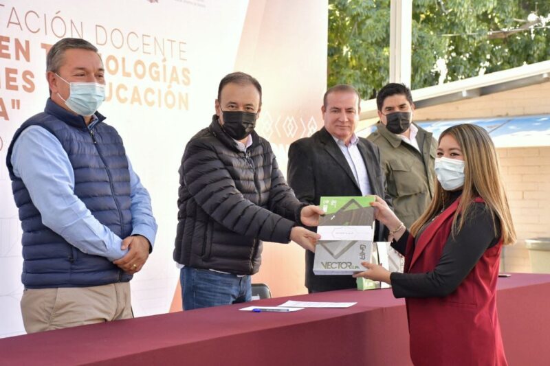 El mandatario estatal, acompañado del presidente del Consejo para el Desarrollo Sostenible del Estado de Sonora (Codeso) Francisco Acuña Méndez, y de la directora de la Escuela Primaria José Lafontaine, María Guadalupe Córdova Gámez, entregó 50 tablets a maestras y maestros de diferentes niveles educativos para dar inicio a este programa de capacitación.
