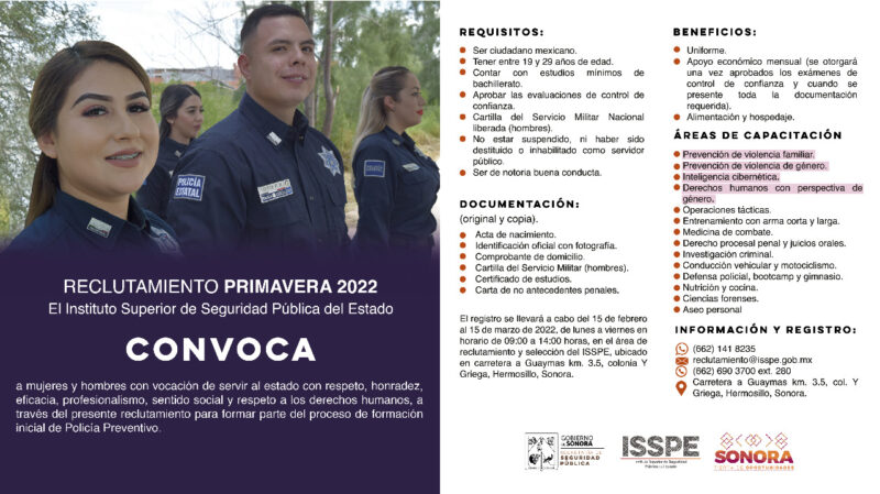 En cumplimiento al compromiso de incrementar el estado de fuerza durante el presente año, el Instituto Superior de Seguridad Pública del Estado (Isspe), dio a conocer la convocatoria de reclutamiento “Primavera 2022”, para las y los interesados en cursar su formación inicial como Policía Preventivo.