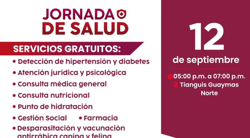 Guaymas, Sonora, 09 de septiembre de 2025.- Con el compromiso de la doctora Karla Córdova González de garantizar que las familias cuenten con servicios que favorezcan la prevención de enfermedades, se prepara para este 12 de septiembre la Jornada de Salud en el tianguis de Guaymas Norte, la cual se llevará a cabo de 17:00 a 19:00 horas.