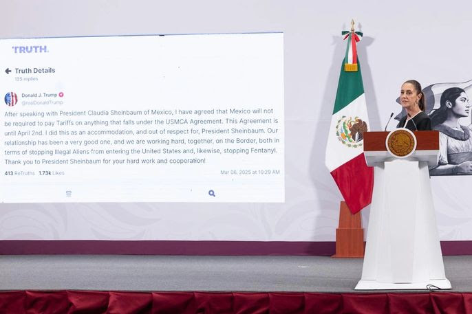 Ciudad de México a 06 de marzo de 2025.- La Presidenta Claudia Sheinbaum Pardo resaltó que México fue tratado con mucho respeto en la llamada de este jueves con el Presidente de Estados Unidos, Donald Trump, con quien acordó que a nuestro país no se le requerirá pagar aranceles en los productos que se encuentren dentro del Tratado entre México, Estados Unidos y Canadá (T-MEC), lo cual tendrá vigencia hasta el 2 de abril, fecha en la que EUA anunciará aranceles recíprocos para todos los países.