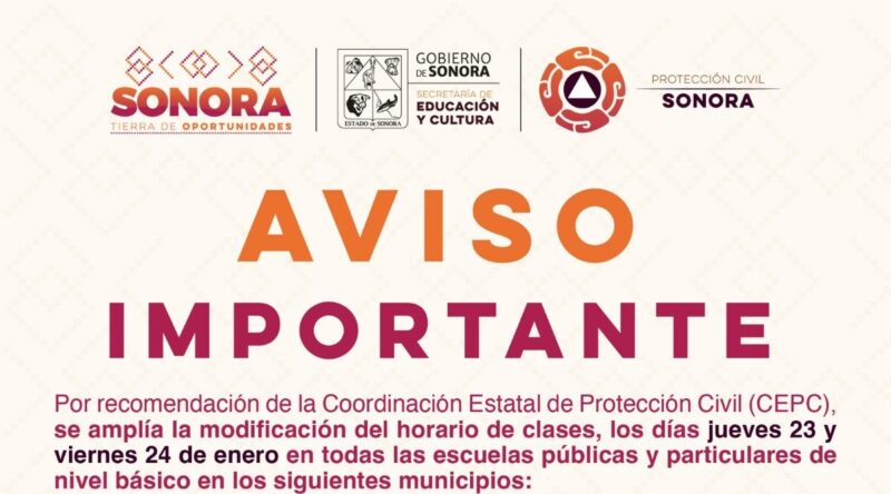 Hermosillo, Sonora; 22 de enero de 2025.- Por recomendación de la Coordinación Estatal de Protección Civil (CEPC) la modificación del horario de clases se ampliará a 13 municipios de Sonora, los días jueves 23 y viernes 24 de enero, ante las condiciones meteorológicas que prevalecen en la región, anunció Froylán Gámez Gamboa.