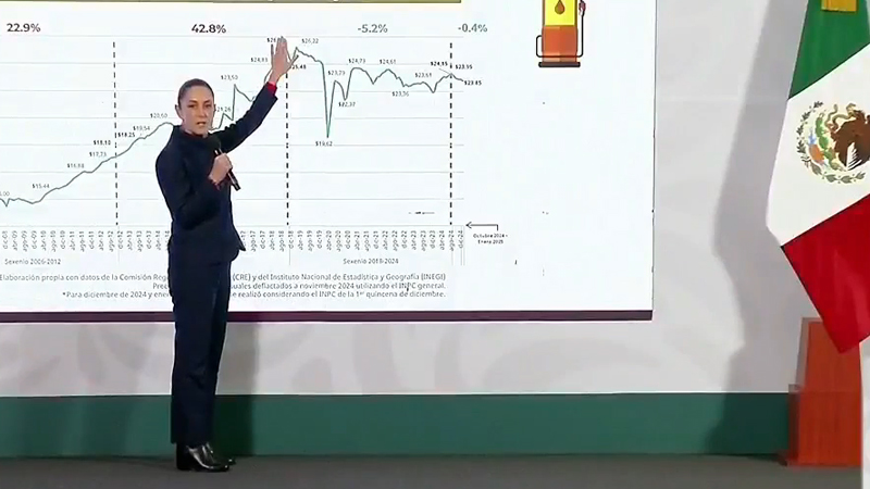 Destacó que desde 2019, los precios de las gasolinas y el diésel se han mantenido por debajo de la inflación acumulada, logrando una disminución real de 11.03 por ciento en el diésel durante las administraciones de López Obrador y la actual.