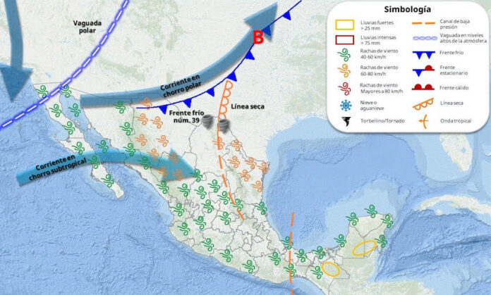 Durante hoy, la aproximación del frente frío (núm. 39) en combinación con una vaguada polar y las corrientes en chorro polar y subtropical sobre el noroeste de Sonora originará descenso de temperatura con un ambiente de frio a fresco, fuertes rachas de viento sobre el norte y oriente, así como en la costa del centro del estado. Por su parte, durante el día domingo, lunes y martes impulsará inestabilidad suficiente para la generación de tormentas aisladas sobre el territorio estatal, estás condiciones podrían venir acompañadas de descargas eléctricas y posible caída de granizo sobre municipios del centro, norte, noroeste, noreste y sur.