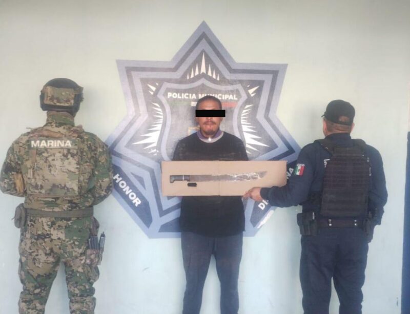 En otro hecho, por las calles Madero entre Durango y Zacatecas de la colonia Centro en la Comisaría de Esperanza, la SSPM y Marina capturaron a Salvador Adrián “N.”, de 32 años de edad, por el presunto delito de portación de arma blanca, asegurándole un objeto tipo machete.