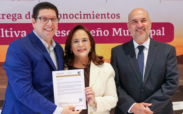 Guaymas, Sonora.- Con el objetivo de incentivar la mejora continua y fortalecer las capacidades institucionales mediante una evaluación sistemática de las distintas áreas de gobierno, el Ayuntamiento de Guaymas a través del Centro Estatal de Desarrollo Municipal (CEDEMUN), recibió este jueves el reconocimiento de la Guía Consultiva de Desempeño Municipal, al obtener el primer lugar en resultado anual más alto del estado de Sonora y el segundo sitio a nivel nacional.