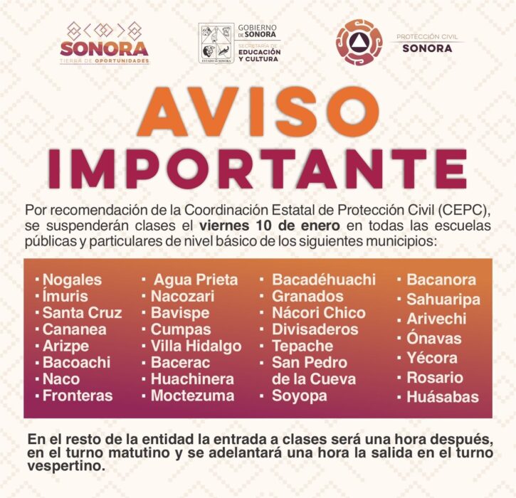 Por recomendación de la Coordinación Estatal de Protección Civil (CEPC) el viernes 10 de enero se mantendrá la suspensión de clases en 30 municipios de Sonora ante las condiciones meteorológicas que prevalecen en la región, anunció Froylán Gámez Gamboa.