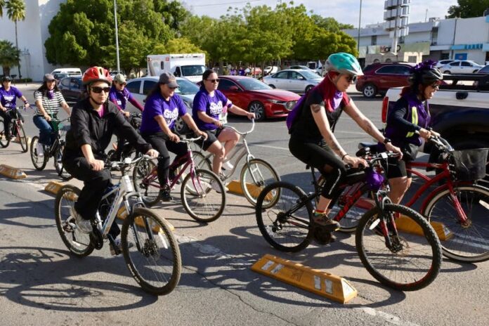 Hermosillo, Sonora.- Decenas de mujeres se sumaron a la «Rodada por las Mujeres» y con ello a la visibilización de las usuarias de la vía pública que se desplazan en este medio de transporte sustentable.