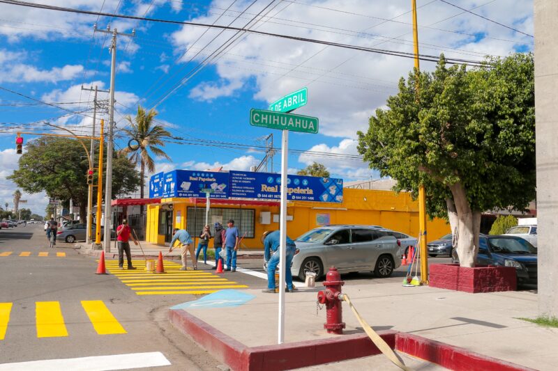 La Secretaría de Seguridad Pública Municipal (SSPM) a través del área de Semaforización y Señalización llevaron a cabo trabajos de rehabilitación en el cruce de las calles Chihuahua y 6 de Abril, con el objetivo de mejorar la seguridad vial y la visibilidad para los peatones.