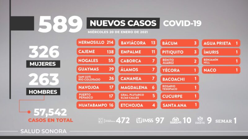 Este día, se registraron 589 nuevos casos por COVID, en 326 mujeres y 263 hombres, para un total de 57 mil 542 casos en la entidad, 214 de los nuevos casos en residentes de Hermosillo; 138 de Cajeme; 55 de Nogales; 29 de Guaymas; 26 de San Luis Río Colorado; 17 de Navojoa; 17 de Puerto Peñasco; 16 de Huatabampo; 13 de Baviácora; 11 de Empalme; siete Caborca; siete de Álamos; siete de Cananea.