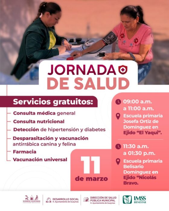 Guaymas, Sonora.- Este miércoles 11, el Ayuntamiento de Guaymas llevará la Jornada de salud a los ejidos El Yaqui y Nicolás Bravo, para trabajar en la prevención de enfermedades y beneficiar a las familias con diferentes servicios.
