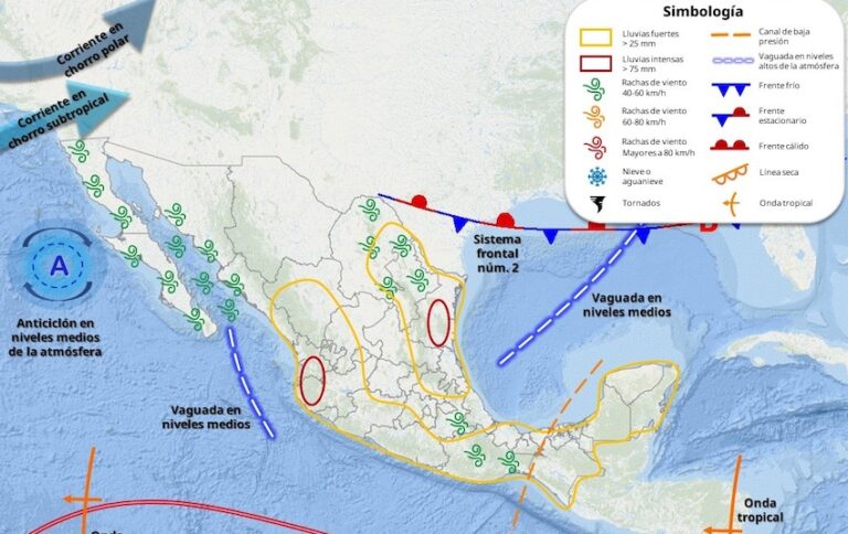 Por su parte, los efectos del monzón mexicano en interacción con divergencia ocasionarán tormentas eléctricas con lluvias ligeras a moderadas (5 a 25mm) y fuertes rachas de viento (+60 km/h) sobre el oriente en horario vespertino.